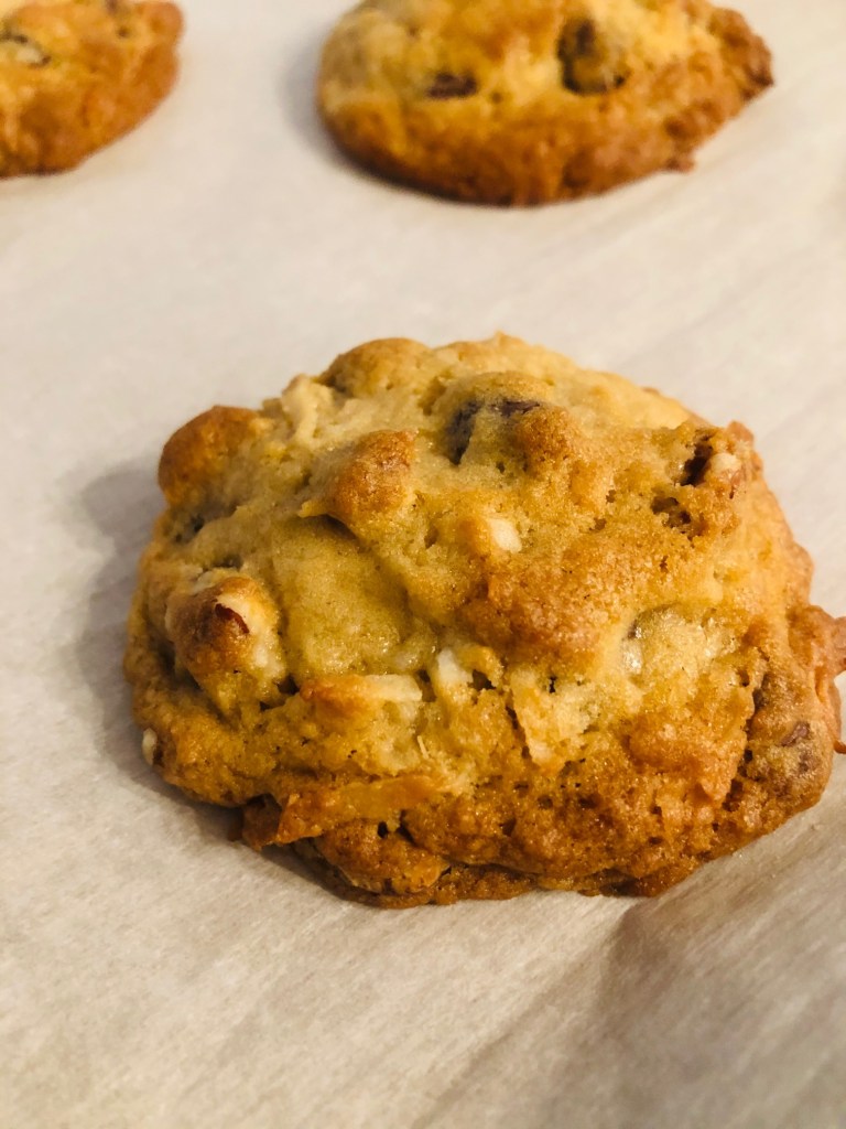 1 2/3 cups flour 2 cups semi-sweet chocolate chips 1 cup flaked coconut 3/4 cup pecans or macadamia nuts