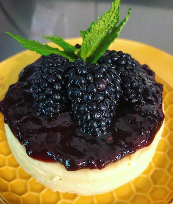 When your cheesecakes are set you can pop them out of the pans and add an assortment of delicious toppings. We like to do fresh blackberries and preserves with a little sprig of mint!